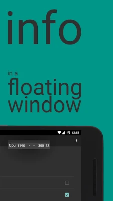 CpuFloat is a floating app which monitors several key pieces of system information so you can monitor your device without leaving the application you are using.