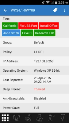 * Review computer information such as operating system, IP address, Deep Freeze status, assigned policies, groups, and tags.