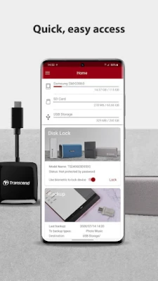 • Browse / Move / Copy / Delete / Share / Rename files between the Portable SSD / JetFlash / OTG card reader and Android device memory • Search / Sort files on the Portable SSD / JetFlash / OTG card reader and Android device memory • Share Photos, Videos, and other files on the Portable SSD / JetFlash / OTG card reader to a variety of cloud storage services • Support enc (encrypted by Transcend Elite Windows) file encryption / decryption • Support Disk Lock with the Transcend Portable SSD (ESD 220C/230C/240C/250C/350C/370C)